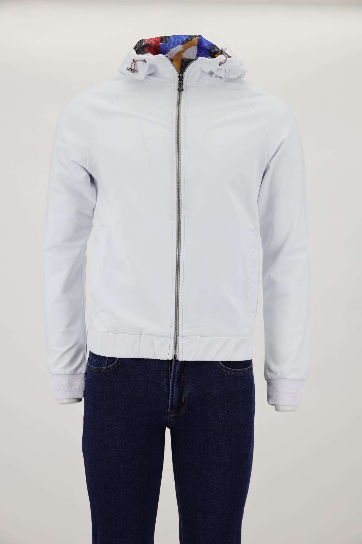Kapüşon yaka, fermuar kapatmalı, baskı ve garni detaylı, iki adet dış cepli.